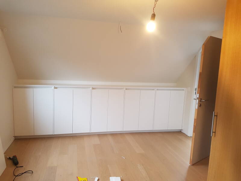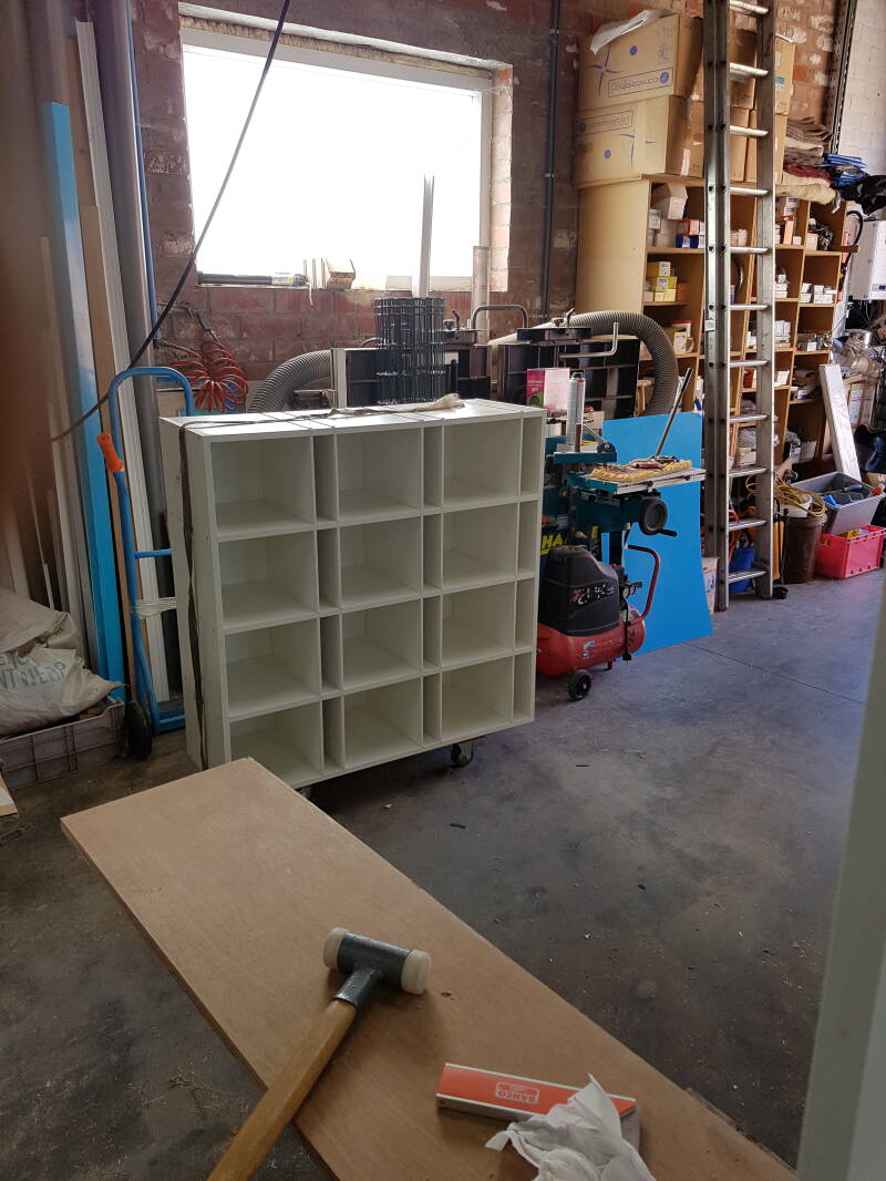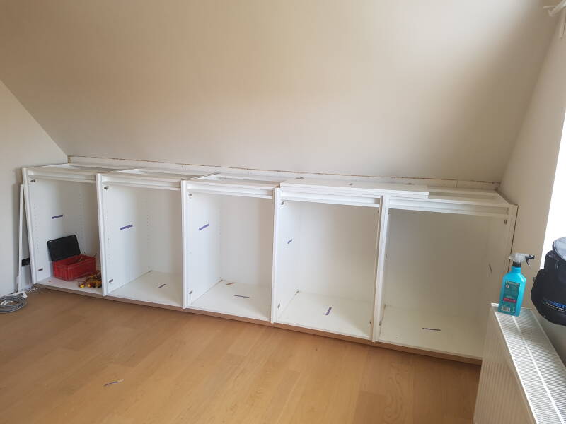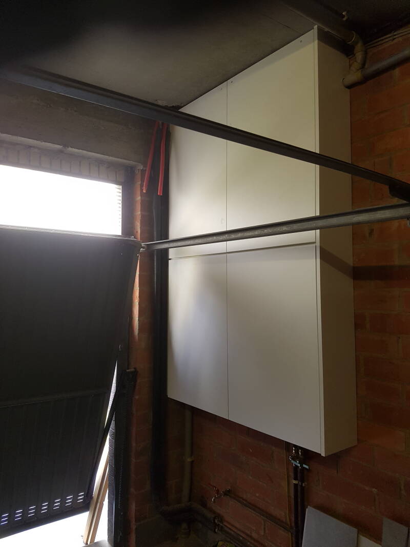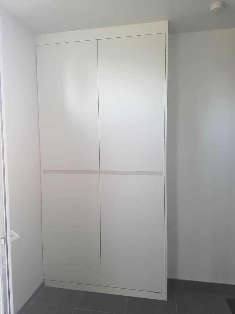 Afgewerkte , opmaat gemaakte nis kast , onderaan die diepe ladenblok voor schoenen en bovenstuk voor jassen en vesten alsook mutsen en sjaals in op te bergen