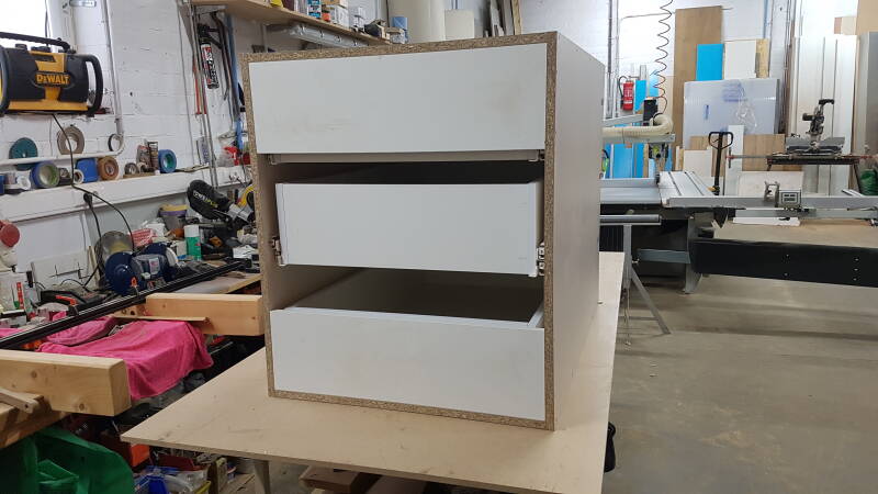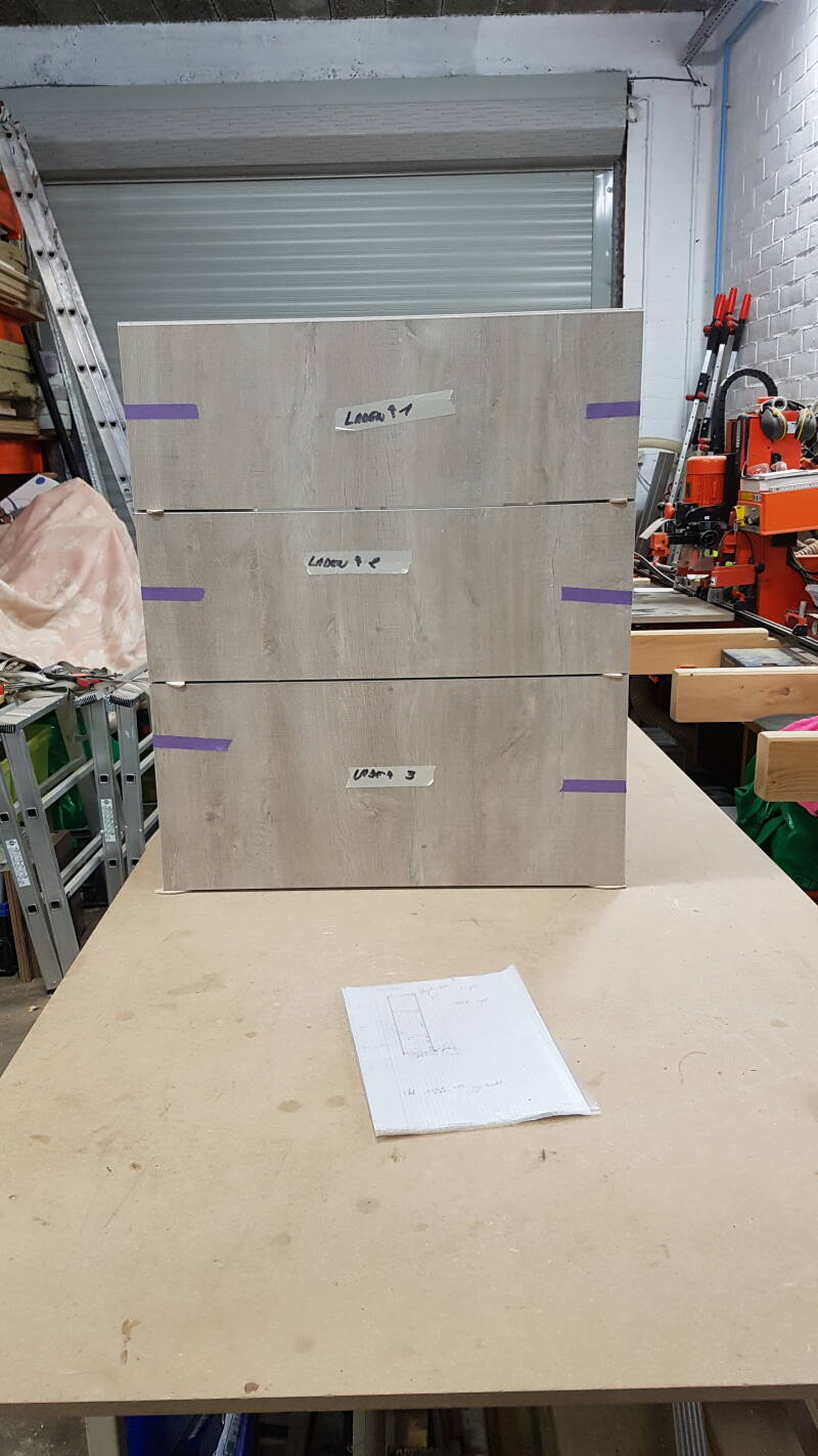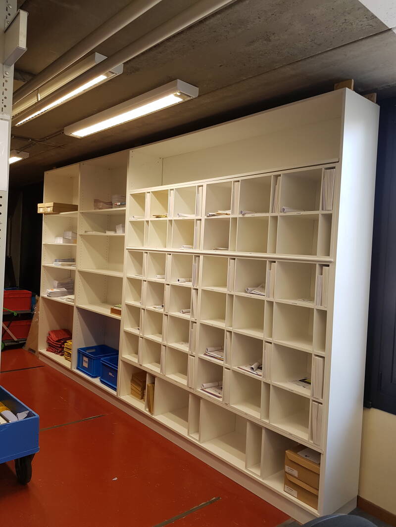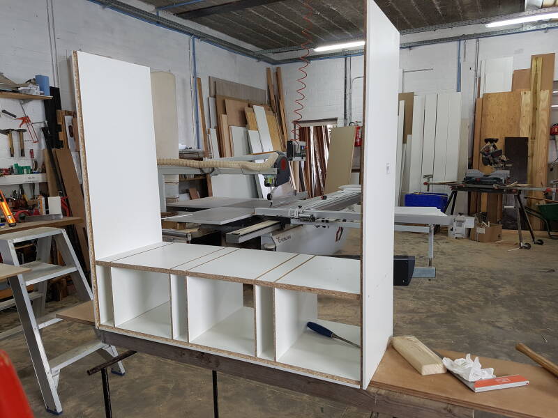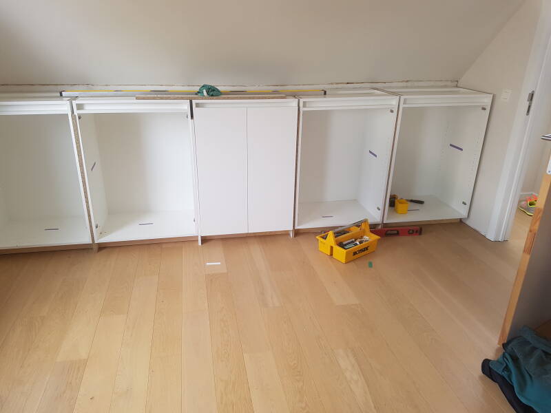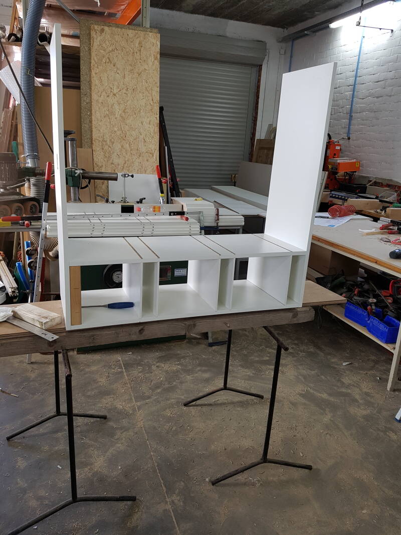 Afgewerkte , opmaat gemaakte nis kast , onderaan die diepe ladenblok voor schoenen en bovenstuk voor jassen en vesten alsook mutsen en sjaals in op te bergen